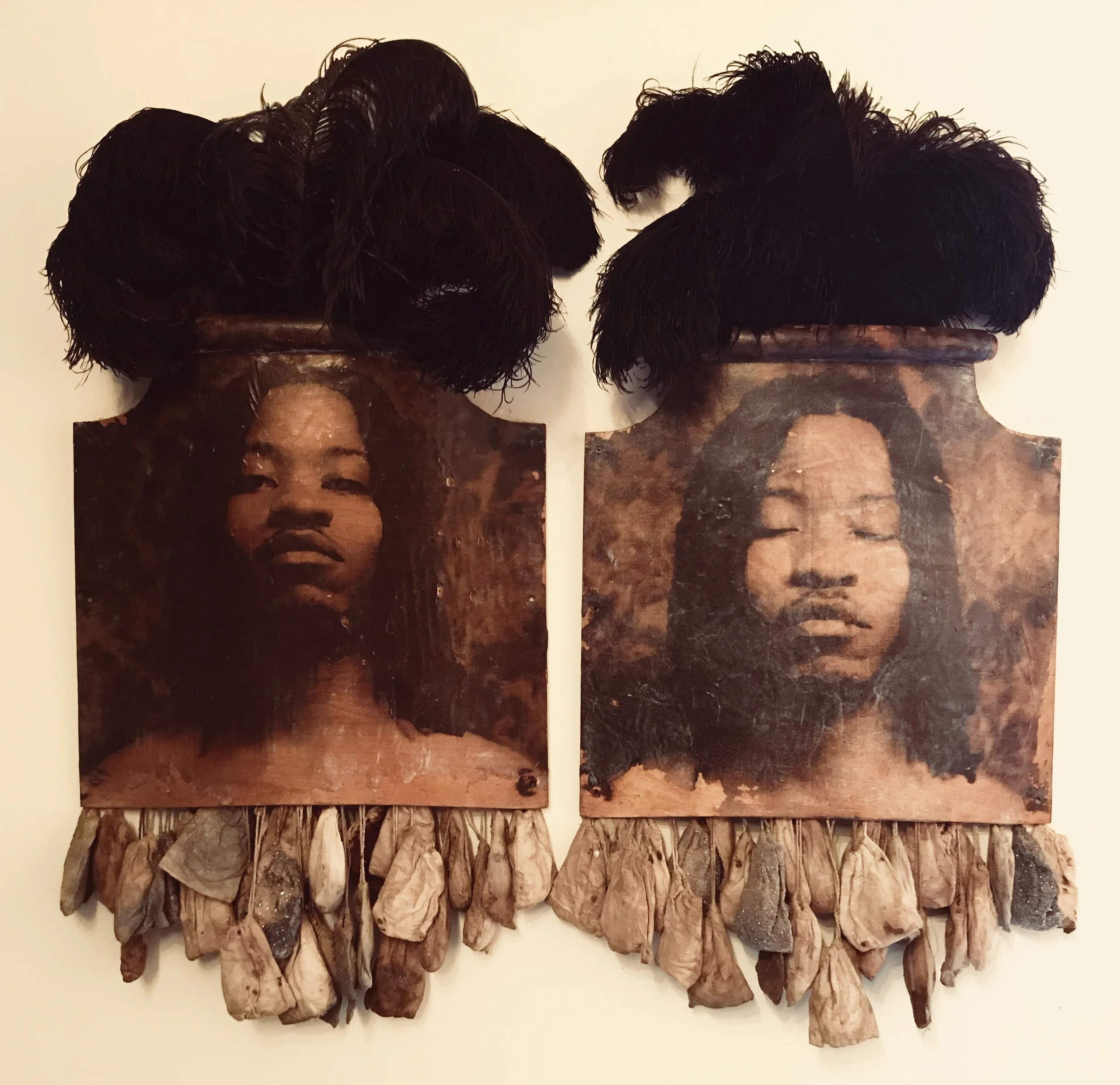 "Consciousness", 2015 - wooden church seat backs, heirloom bags, ostrich feathers, acrylic and oil (18" x 35" x 8") each