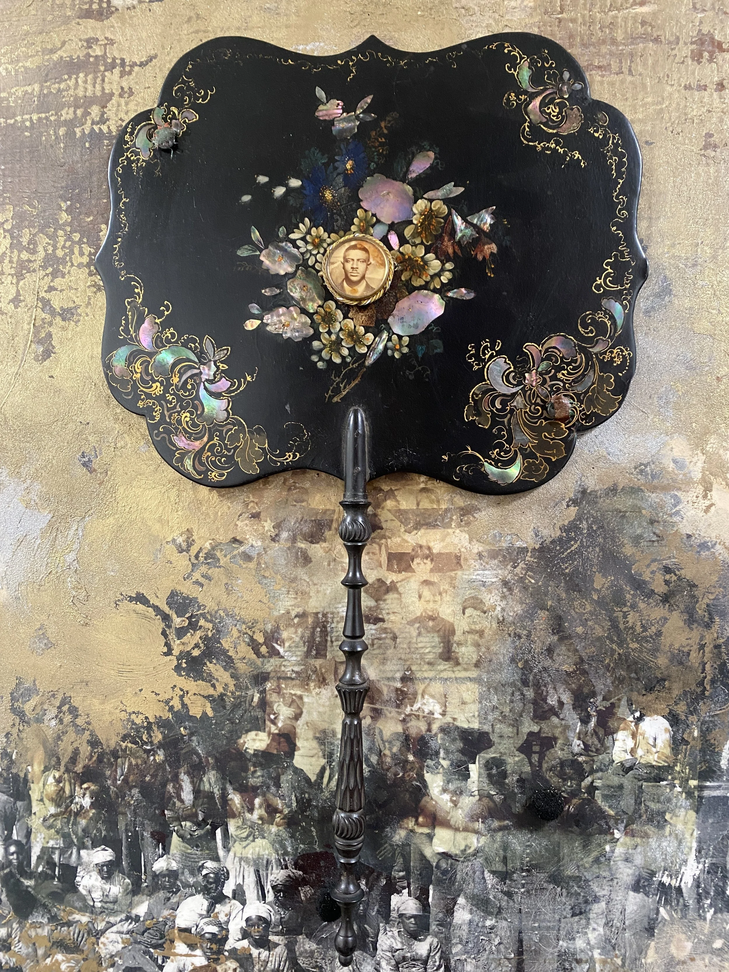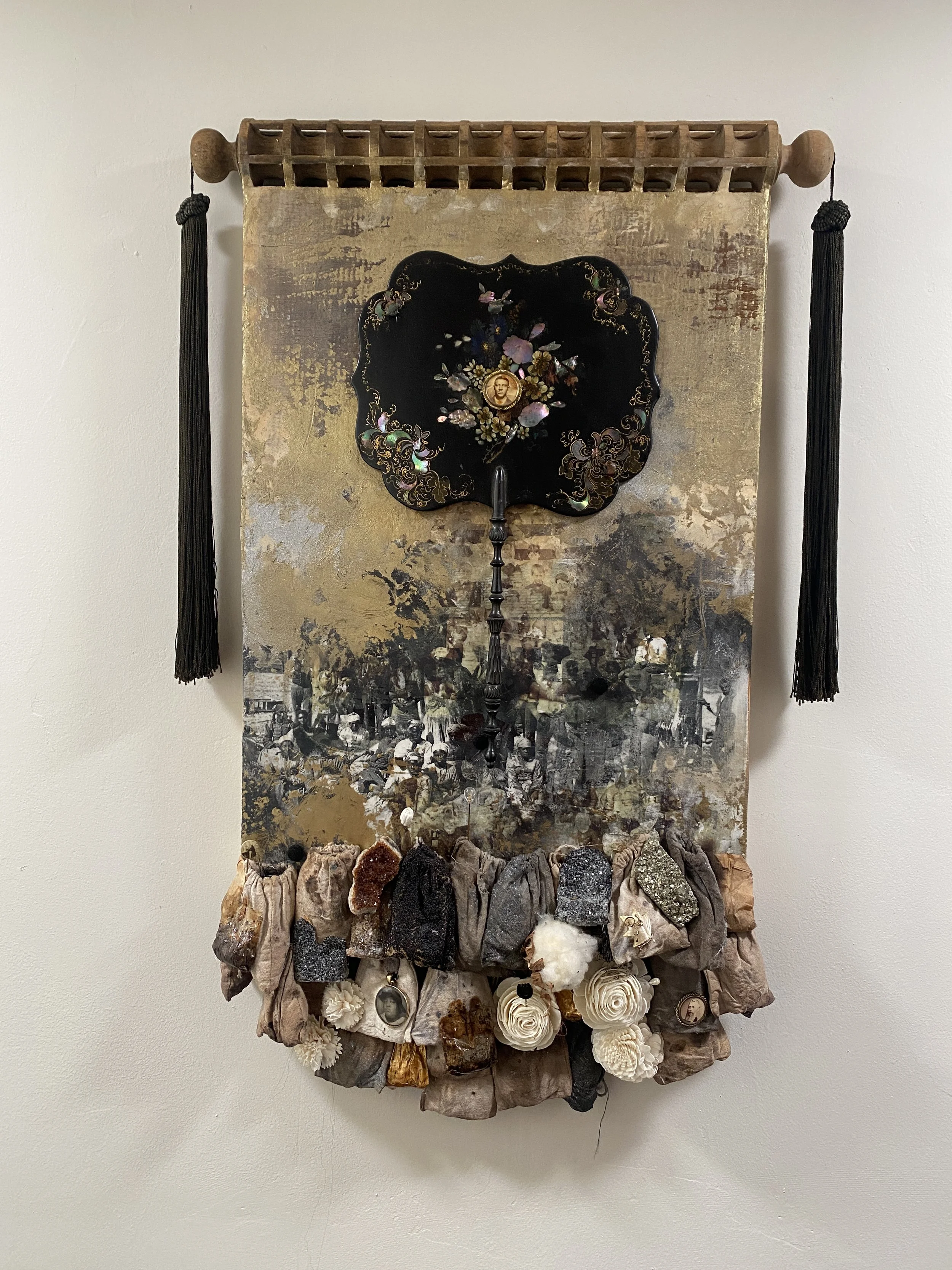 " Forever Free", 2022 - victorian mourning pins, Tennessee cotton, heirloom bags, antique silk tassels, paper flowers, rolling pin, antique hand fan, mother of pearl, acrylic, and oil on wood (21" x 33" x 4")