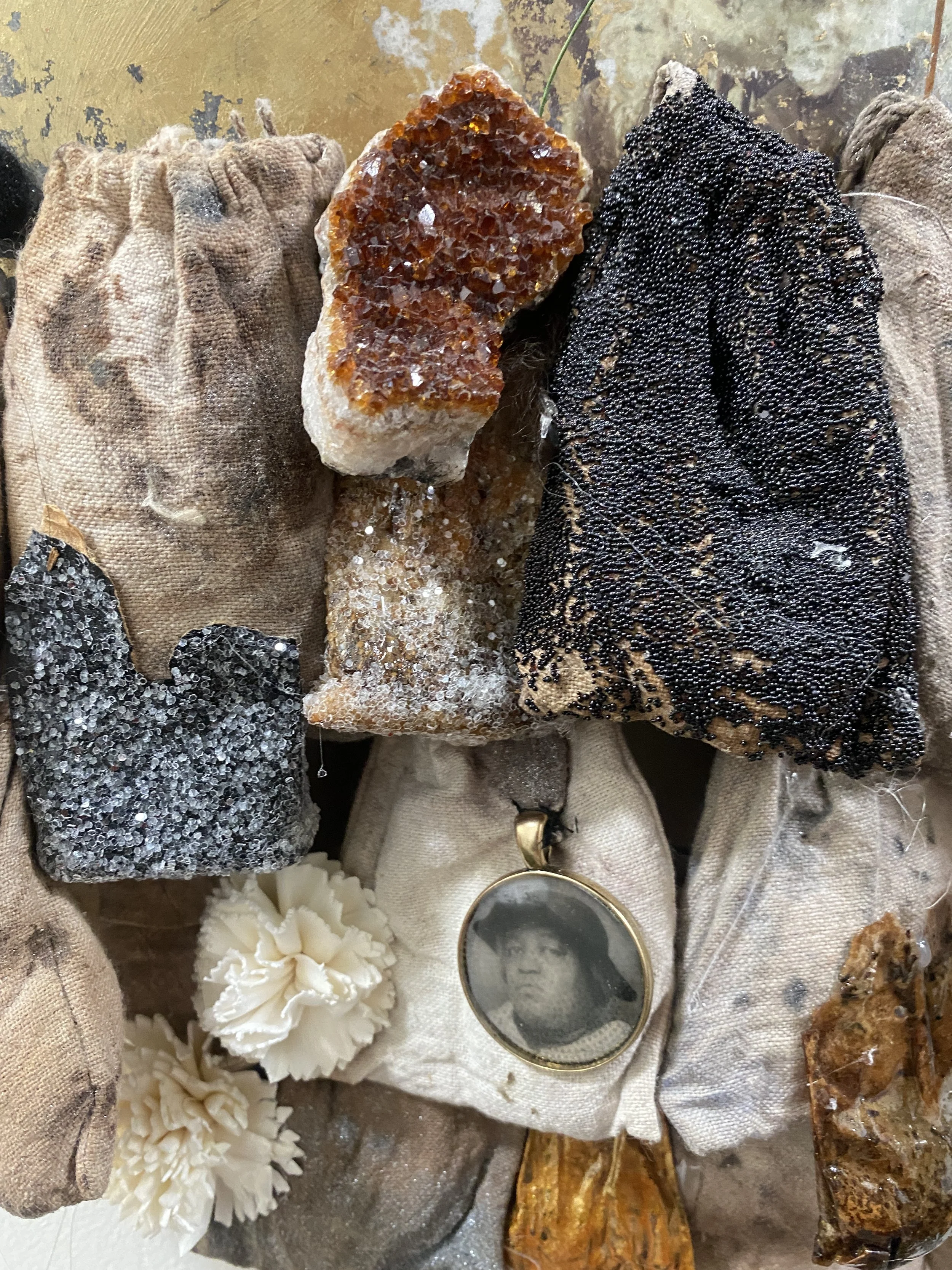 " Quiet Hour", 2022 - vail, heirloom bags, antique wooden domes, pearl, Egyptian head