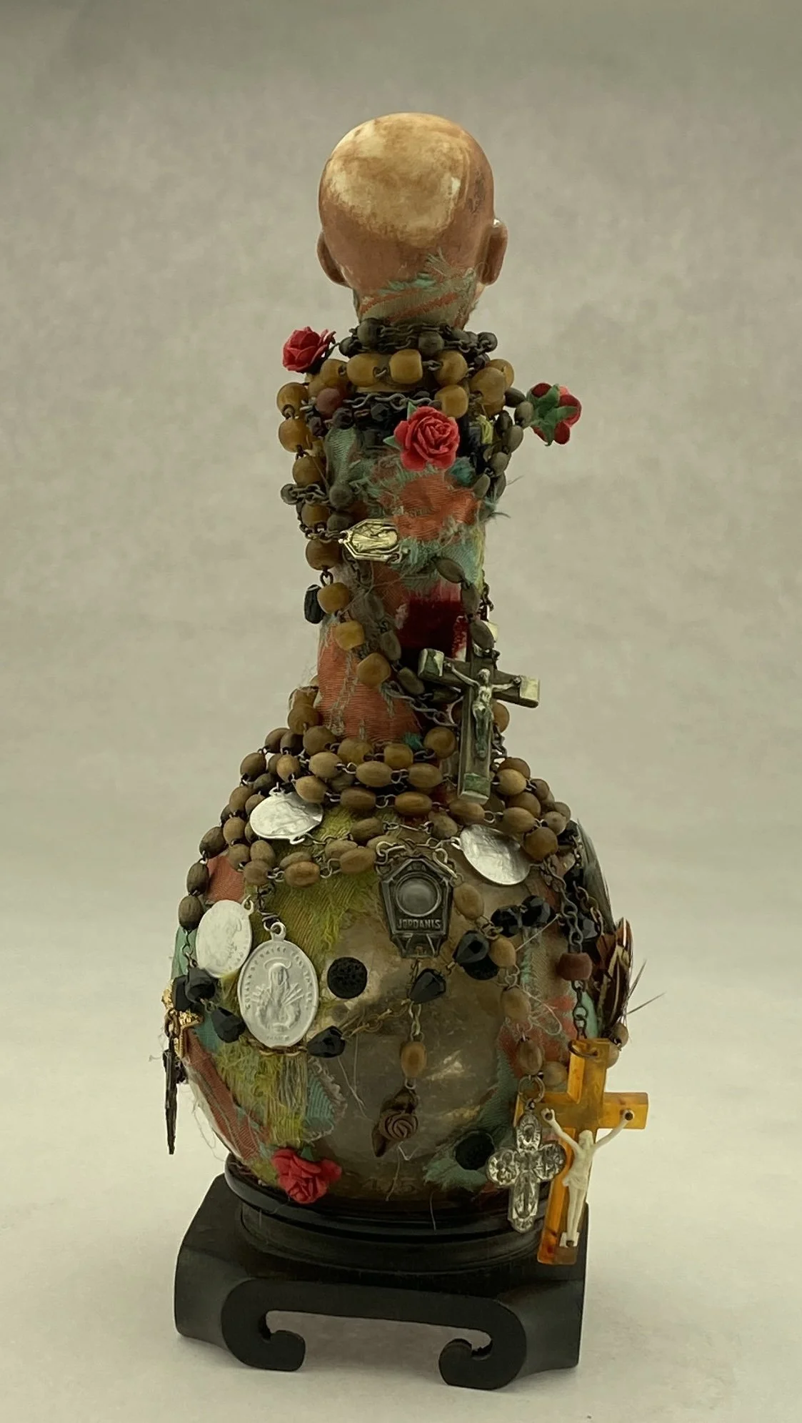 "Protection", 2022 - glass bottle, ceramic head, velvet, antique silk (4" x 12" x 4")